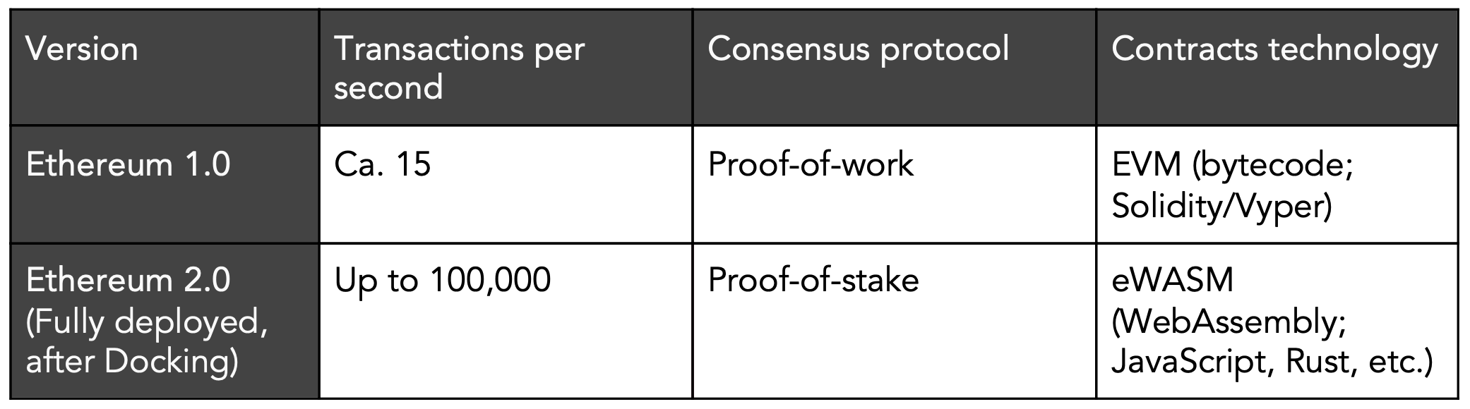 - A new virtual machine, which is essentially the computing system processing smart contracts. The legacy Ethereum Virtual Machine (EVM) will be replaced by a new one (eWASM) based on the WebAssembly technology, which will be faster and will allow developers to code in general-purpose languages such as JavaScript and Rust.
